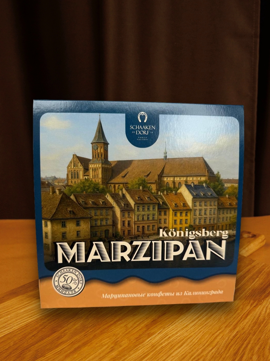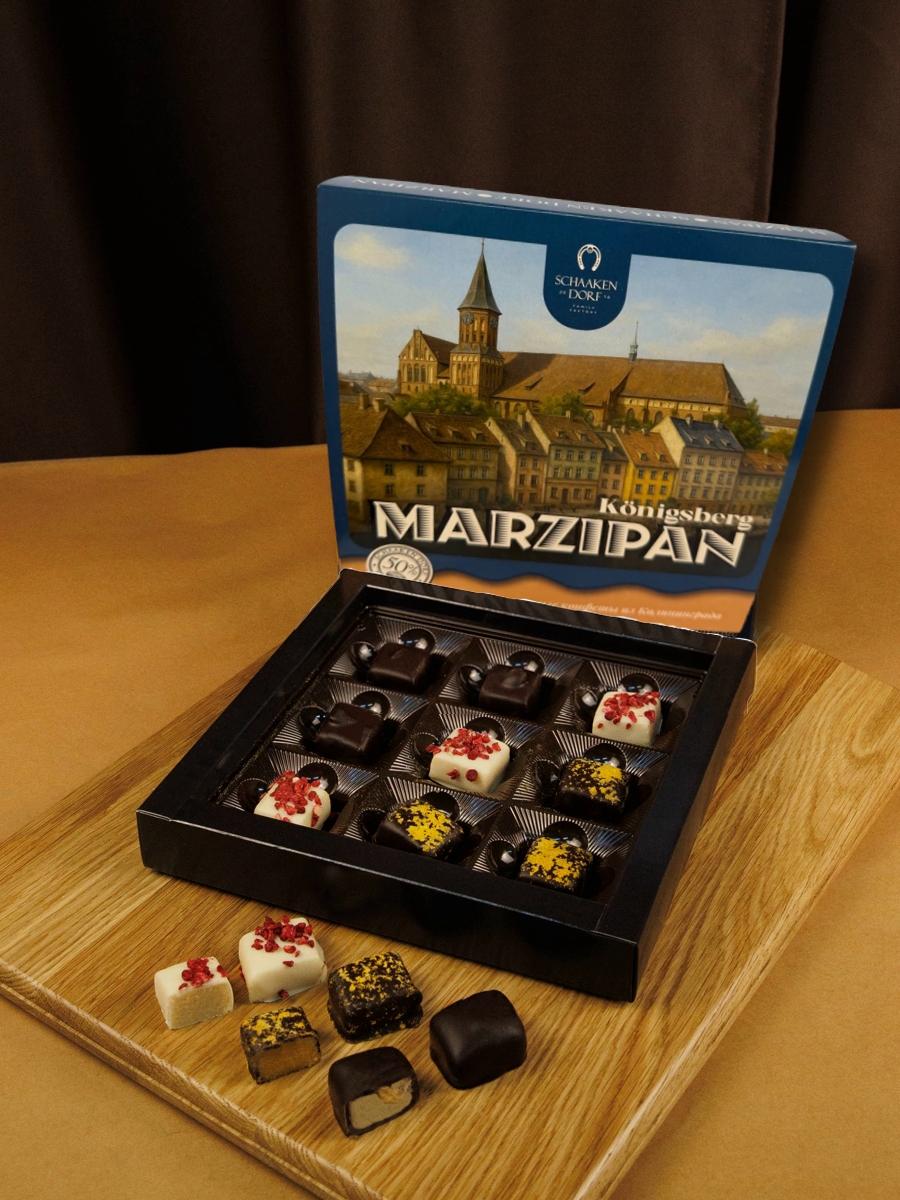 Ассорти из марципановых конфет (содержание миндаля 50%) в натуральном шоколаде. Подарочная коробка с видами Калининграда.