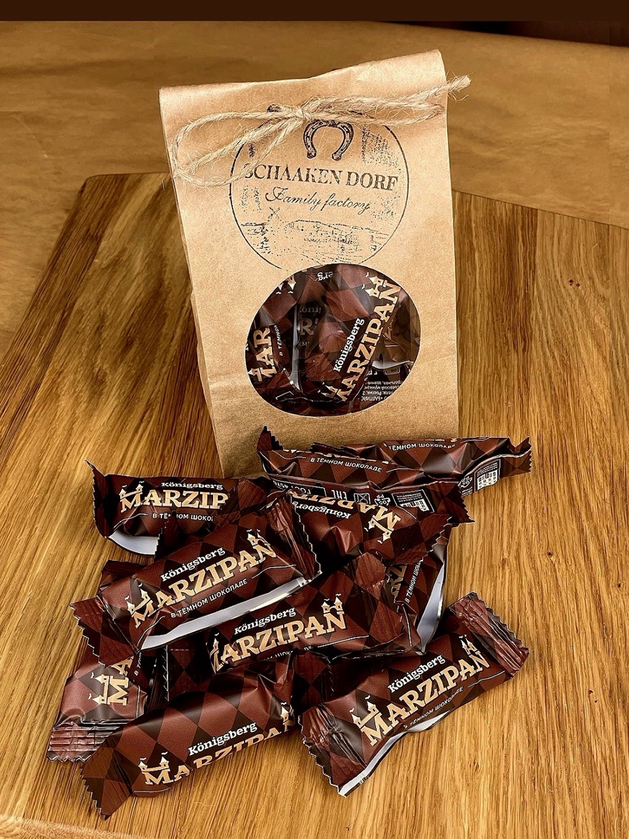Марципановые конфеты в натуральном темном шоколаде. Крафт-пакет с прозрачным окошком.