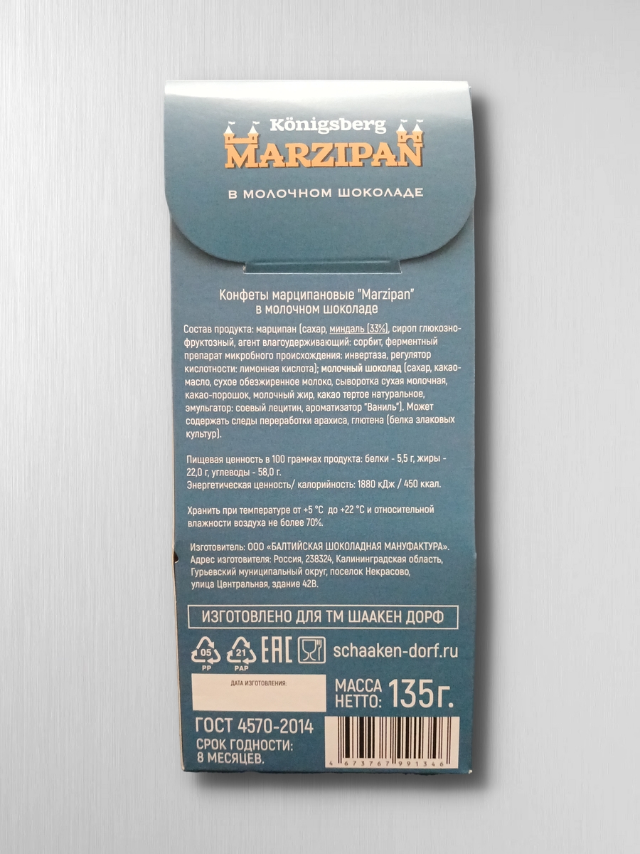Состав: марципан (сахар, миндаль (33%), сироп глюкозно-фруктозный, агент влагоудерживающий: сорбит, ферментный препарат микробного происхождения: инвертаза, регулятор кислотности: лимонная кислота); молочный шоколад (сахар, какао-масло, сухое обезжиренное молоко, сыворотка сухая молочная, какао-порошок, молочный жир, какао тертое натуральное, эмульгатор: соевый лецитин, ароматизатор "Ваниль").