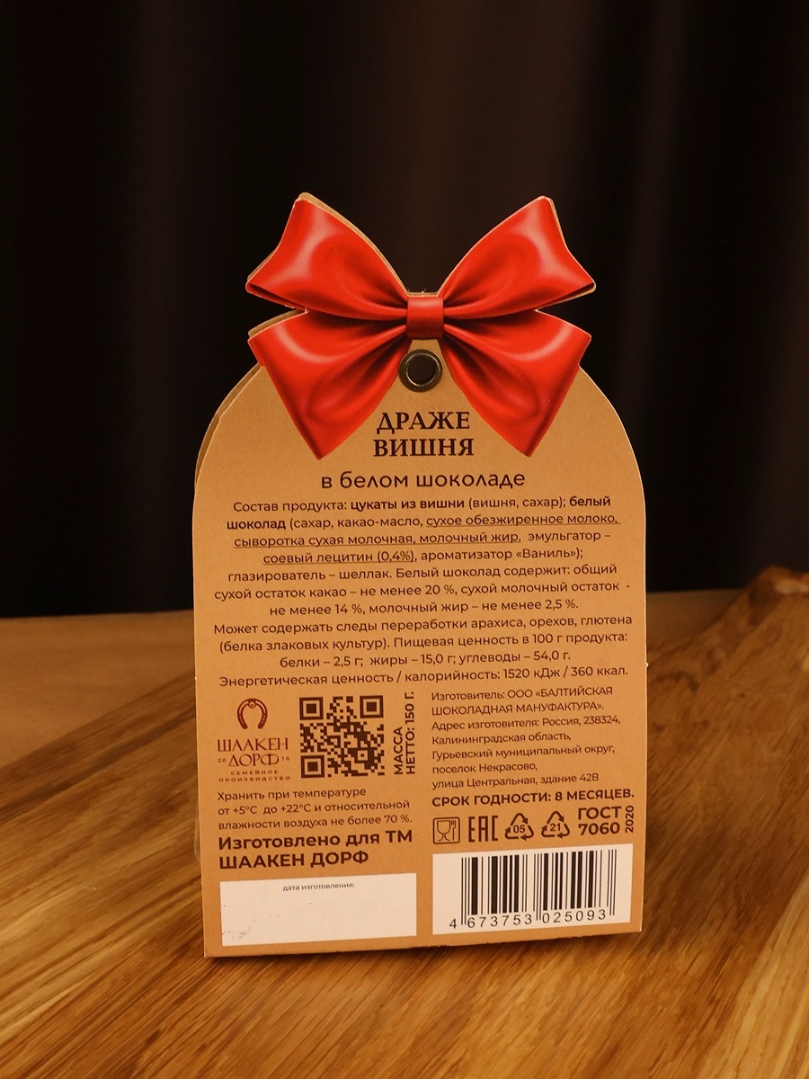 Состав: цукаты из вишни (вишня, сахар); белый шоколад (сахар, какао-масло, сухое обезжиренное молоко, сыворотка сухая молочная, молочный жир, эмульгатор – соевый лецитин (0,4%), ароматизатор «Ваниль»); глазирователь – шеллак. Может содержать следы переработки арахиса, глютена (белка злаковых культур).