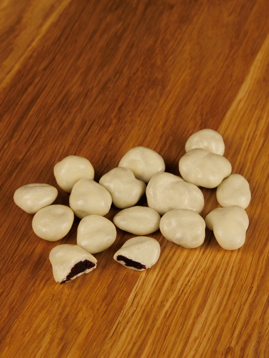 Вяленая вишня в натуральном белом шоколаде.