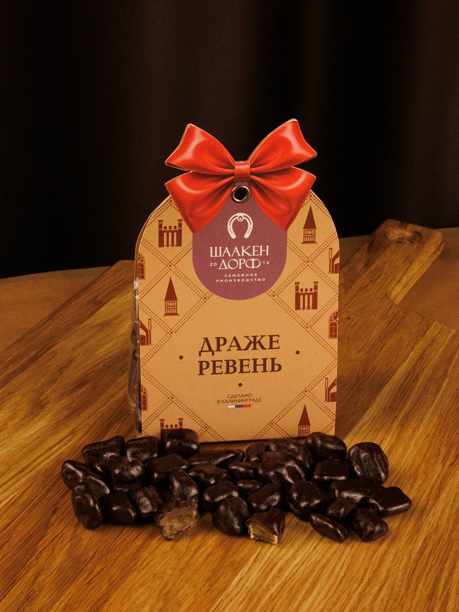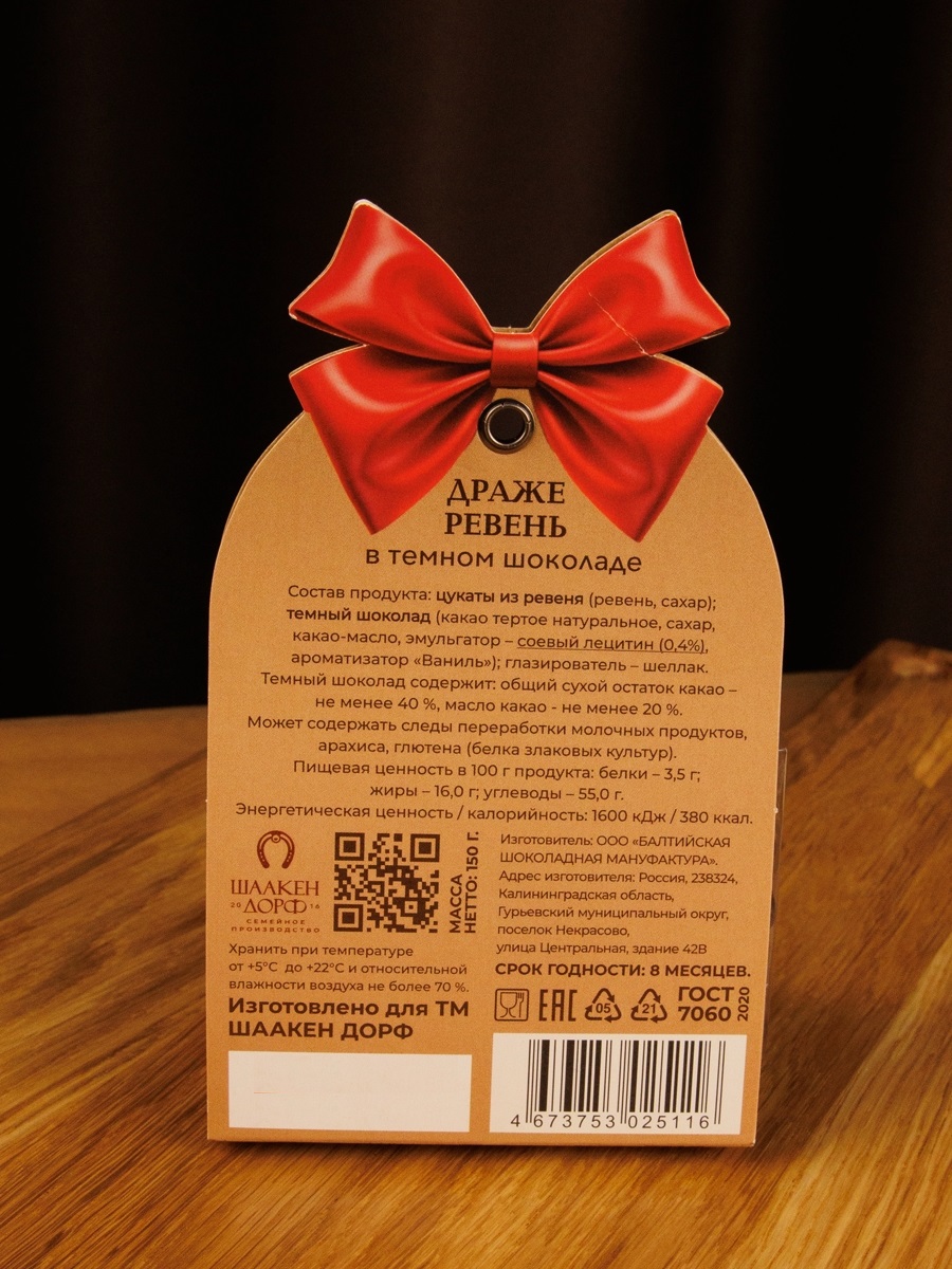 Состав: цукаты из ревеня (ревень, сахар); темный шоколад (какао тертое натуральное, сахар, какао-масло, эмульгатор – соевый лецитин (0,4%), ароматизатор «Ваниль»); глазирователь – шеллак. Может содержать следы переработки молочных продуктов, арахиса, глютена (белка злаковых культур).