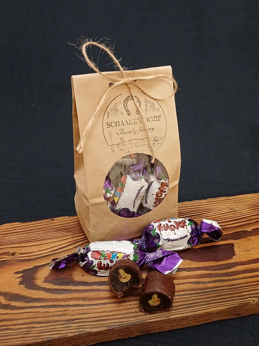 Чернослив с грецким орехом в натуральном темном шоколаде. 10 конфет в крафт-пакете.