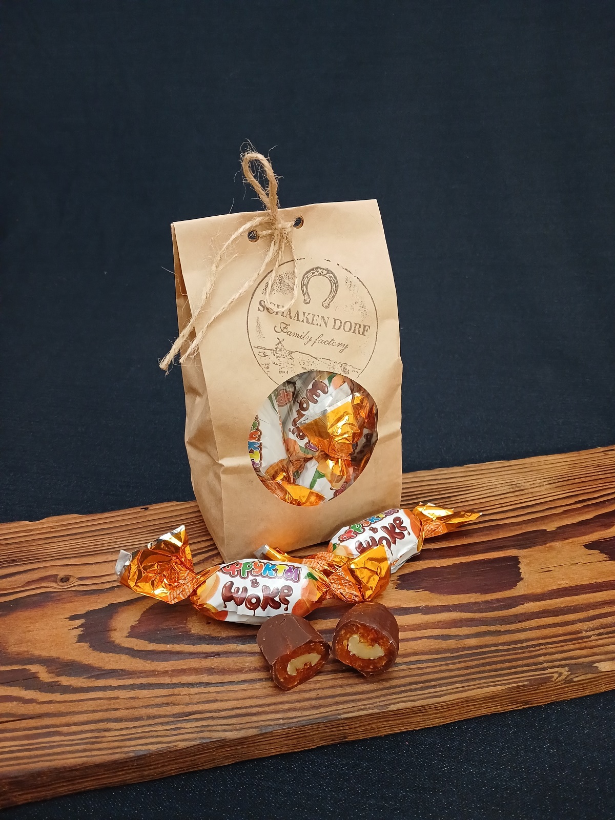 Курага в темном шоколаде с грецким орехом. 10 конфет в крафт-пакете.