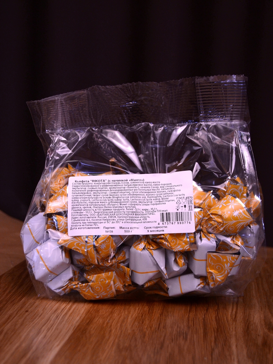 Состав продукта: кондитерская глазурь (сахар, заменитель какао-масла - пальмоядровое масло), какао-порошок, эмульгатор: соевый лецитин, ароматизатор «Ваниль»; начинка: сахар, рафинированные дезодорированные растительные масла, эмульгатор (соевый лецитин), сухое обезжиренное молоко, сыворотка сухая молочная, творог сухой, заквасочная культура, порошок манго сублимационной сушки, ароматизатор «Йогурт»". Может содержать следы переработки арахиса, орехов, глютена.