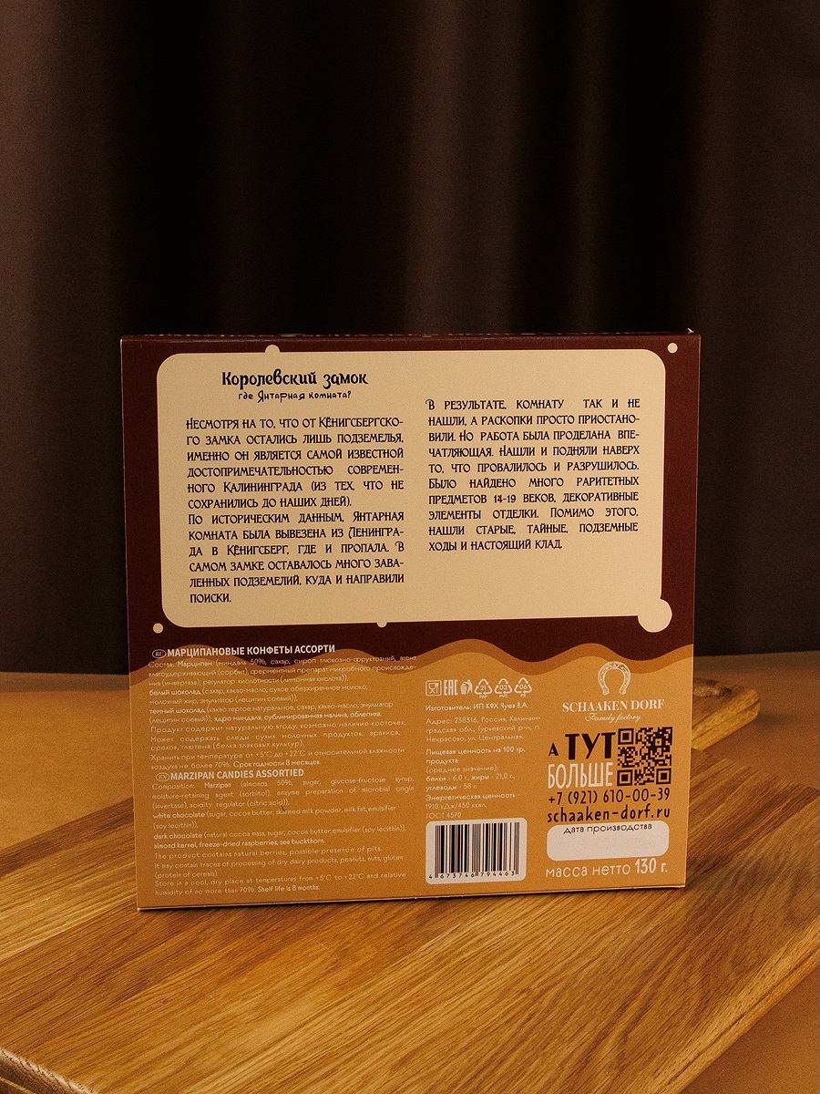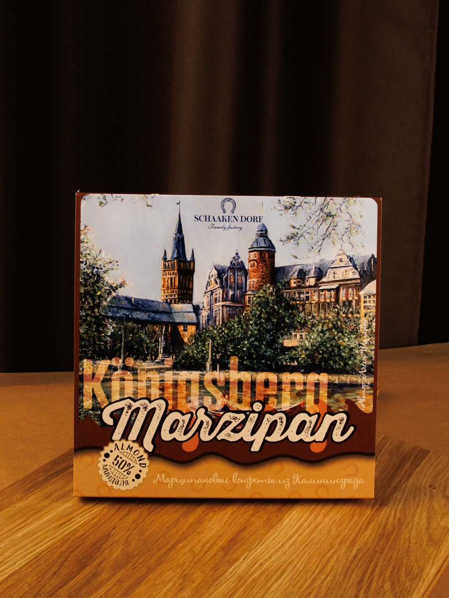 Ассорти из марципановых конфет (содержание миндаля 50%) в натуральном шоколаде. Подарочная коробка с видами Калининграда.