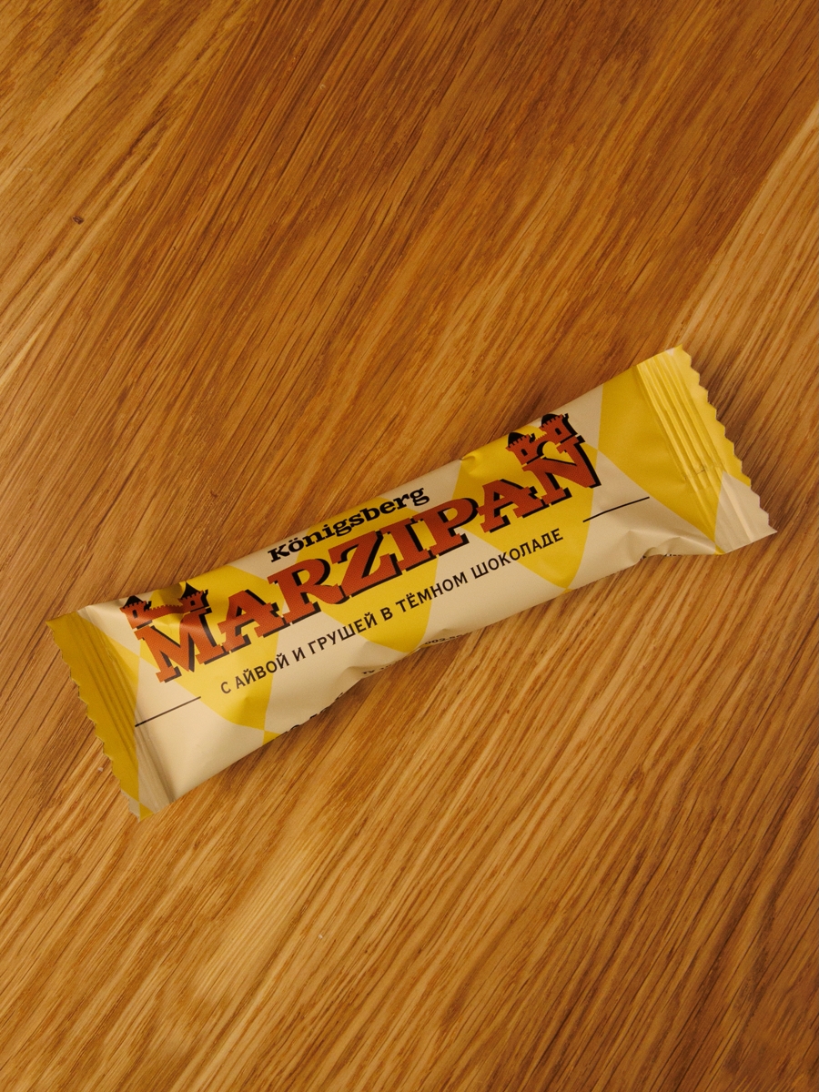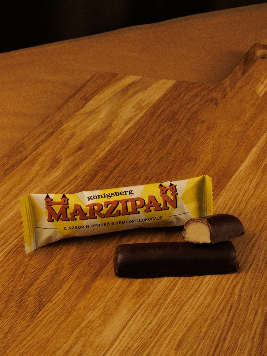 Марципановый батончик (33% миндаля) с цукатами из айвы и груши в натуральном темном шоколаде.