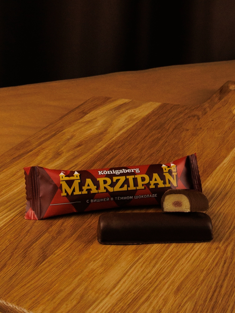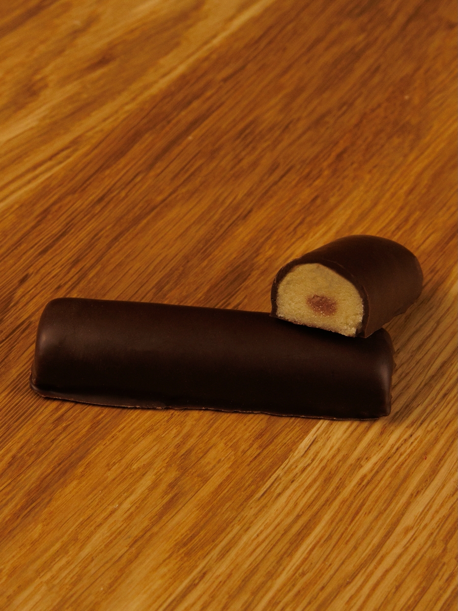 Марципановый батончик (33% миндаля) с цукатами из вишни в натуральном темном шоколаде.
