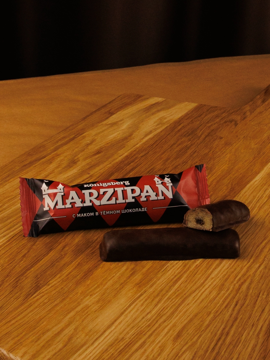 Марципановый батончик (33% миндаля) с маком в натуральном темном шоколаде.