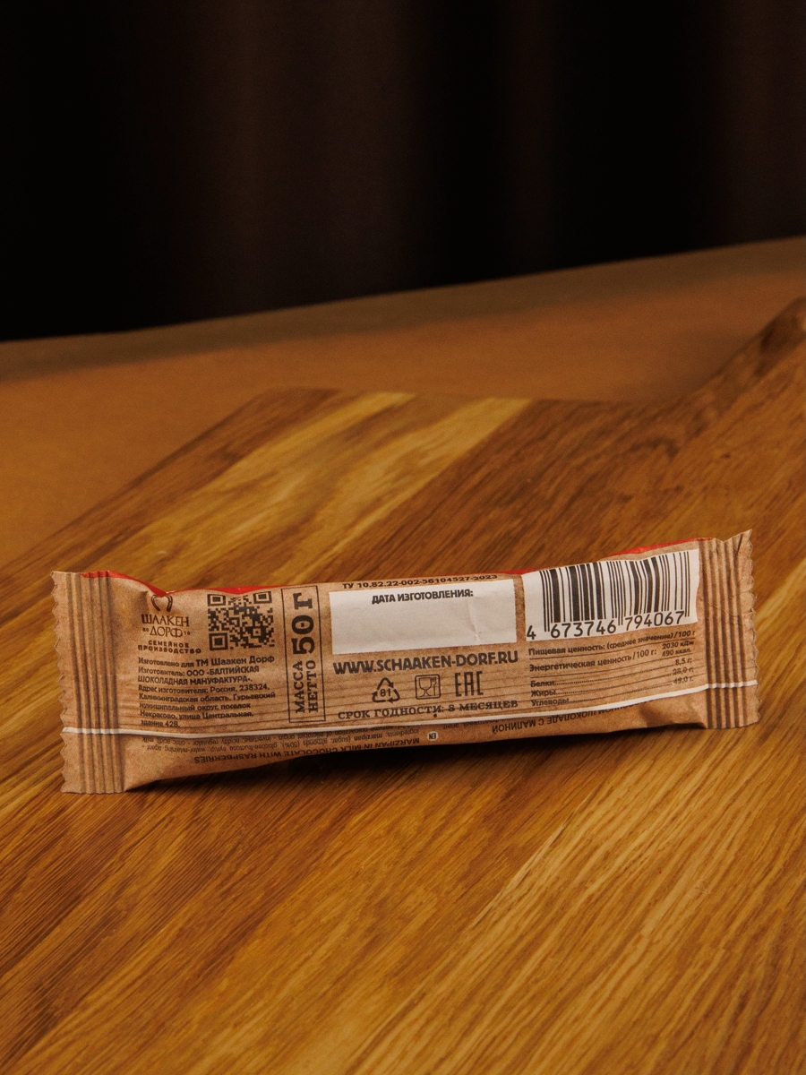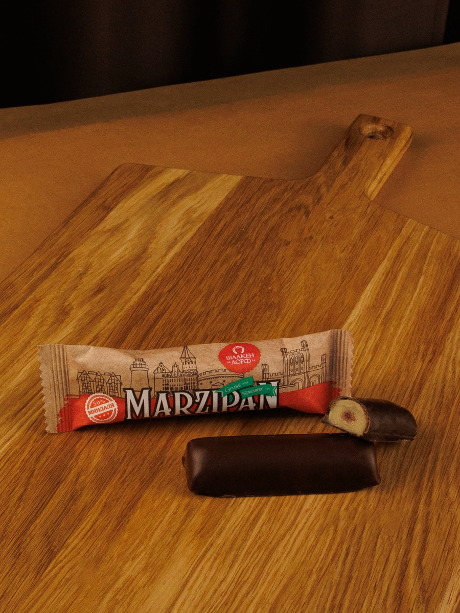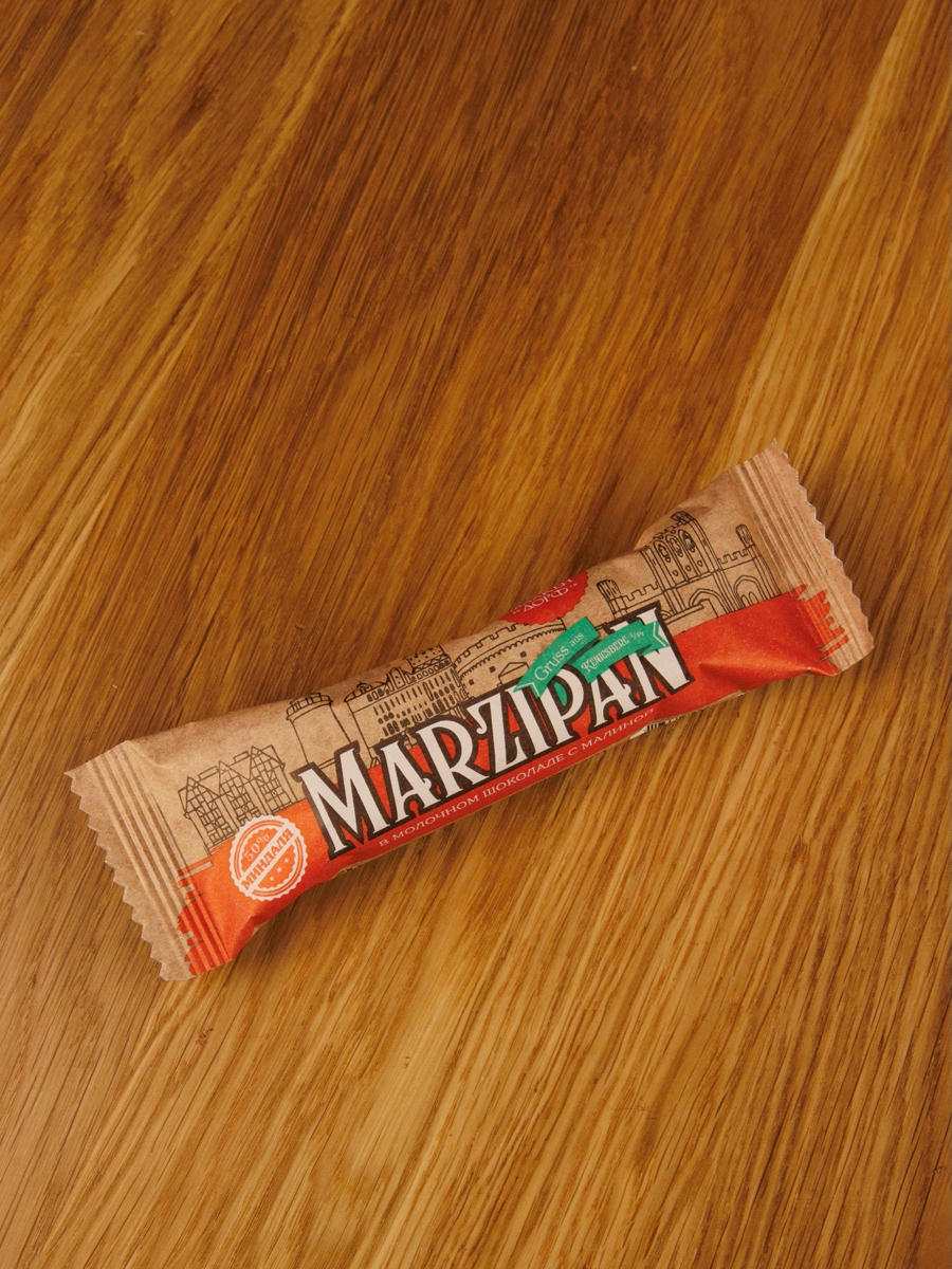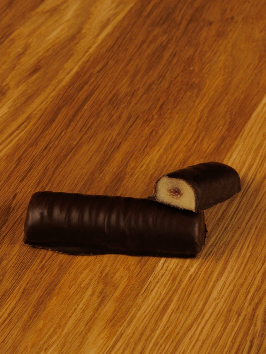 Марципановый батончик (50% миндаля) с сублимированной малиной в натуральном молочном шоколаде.