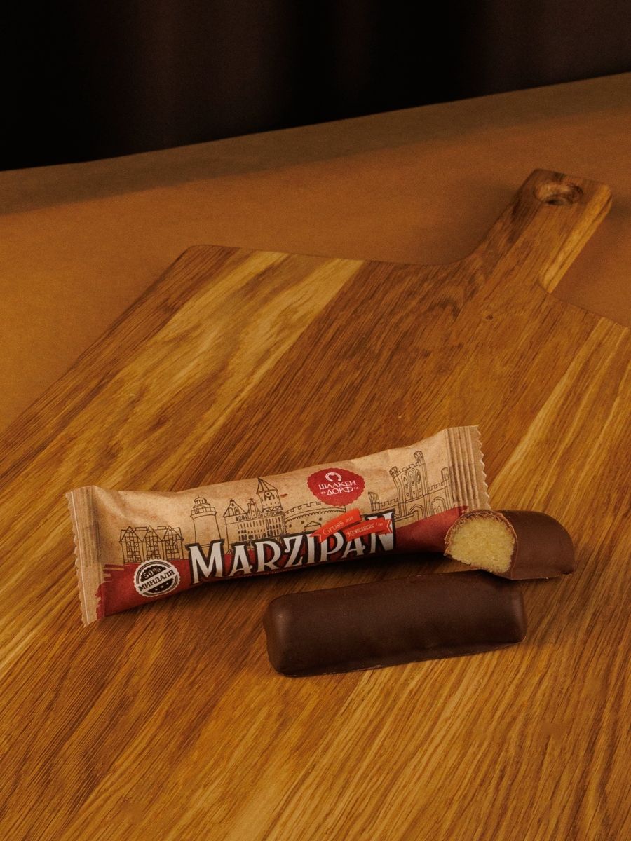 Марципановый батончик (50% миндаля) с сублимированной вишней в натуральном темном шоколаде.