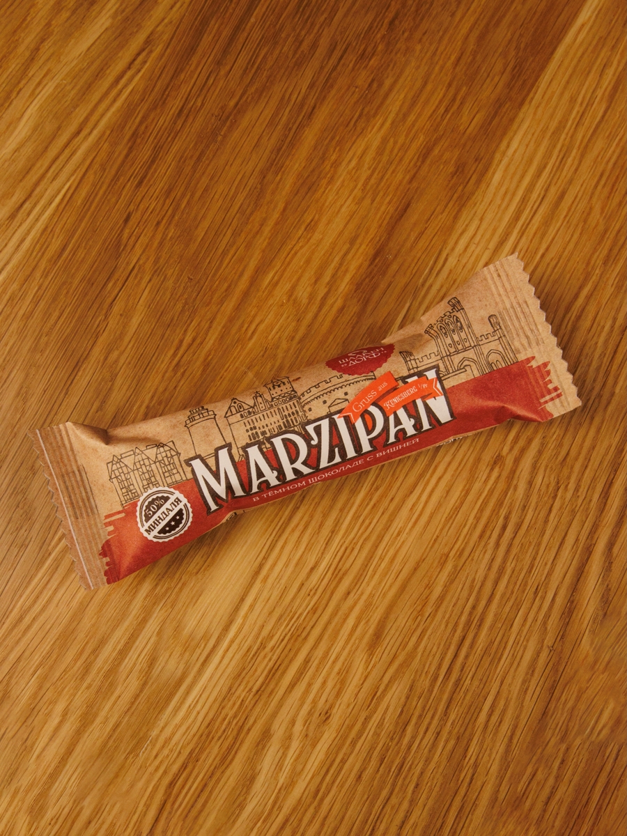 Состав: марципан (сахар, миндаль (50%), сироп глюкозно-фруктозный, сорбит, инвертаза, регулятор кислотности); темный шоколад (какао тертое натуральное, сахар, какао-масло, эмульгатор – соевый лецитин, ароматизатор «Ваниль»); вишня сублимационной сушки. Может содержать следы переработки молочных продуктов, арахиса, глютена (белка злаковых культур). Возможно наличие косточек в ягодах вишни.