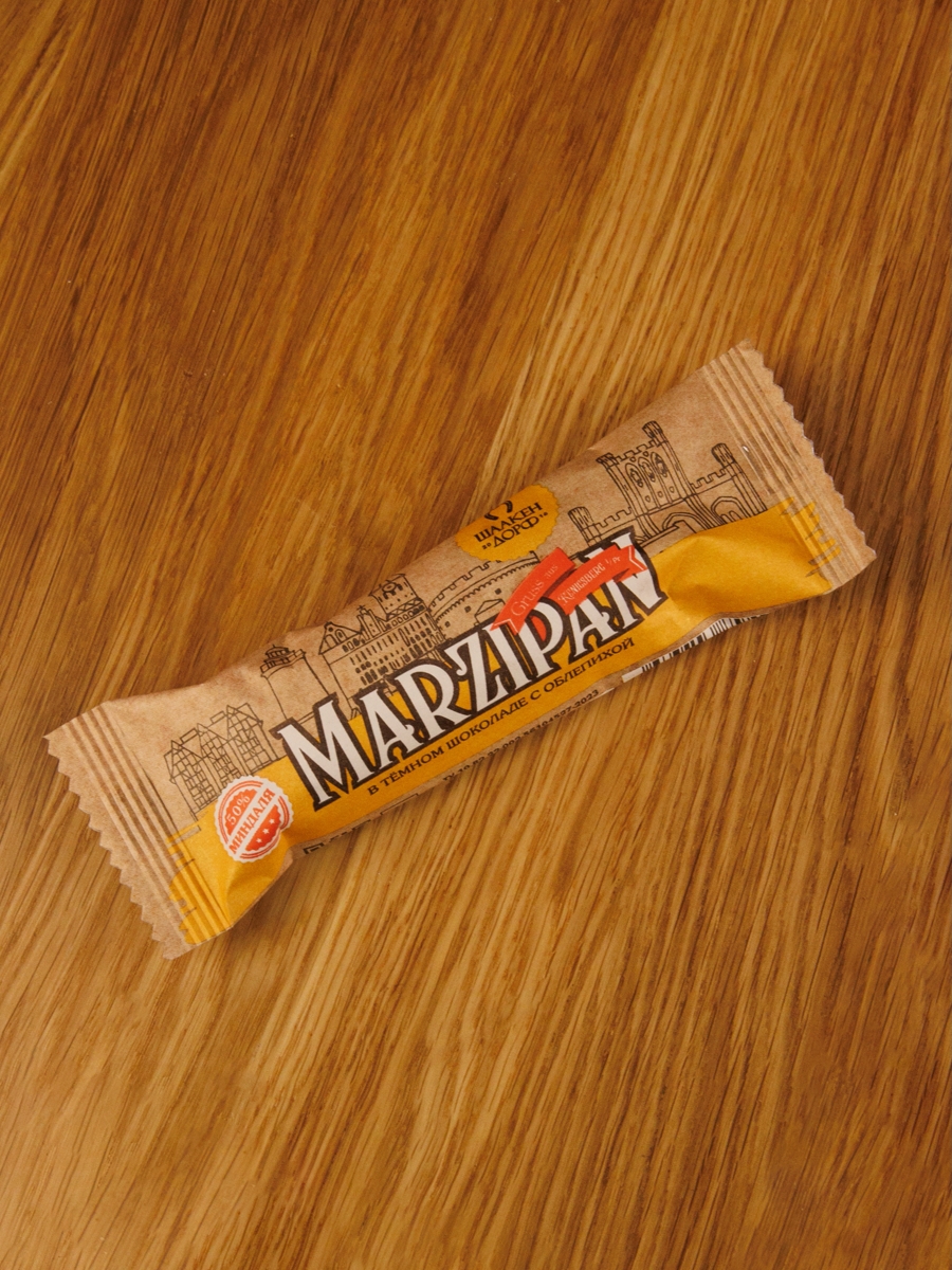 Марципановый батончик (50% миндаля) с сублимированной облепихой в натуральном темном шоколаде.