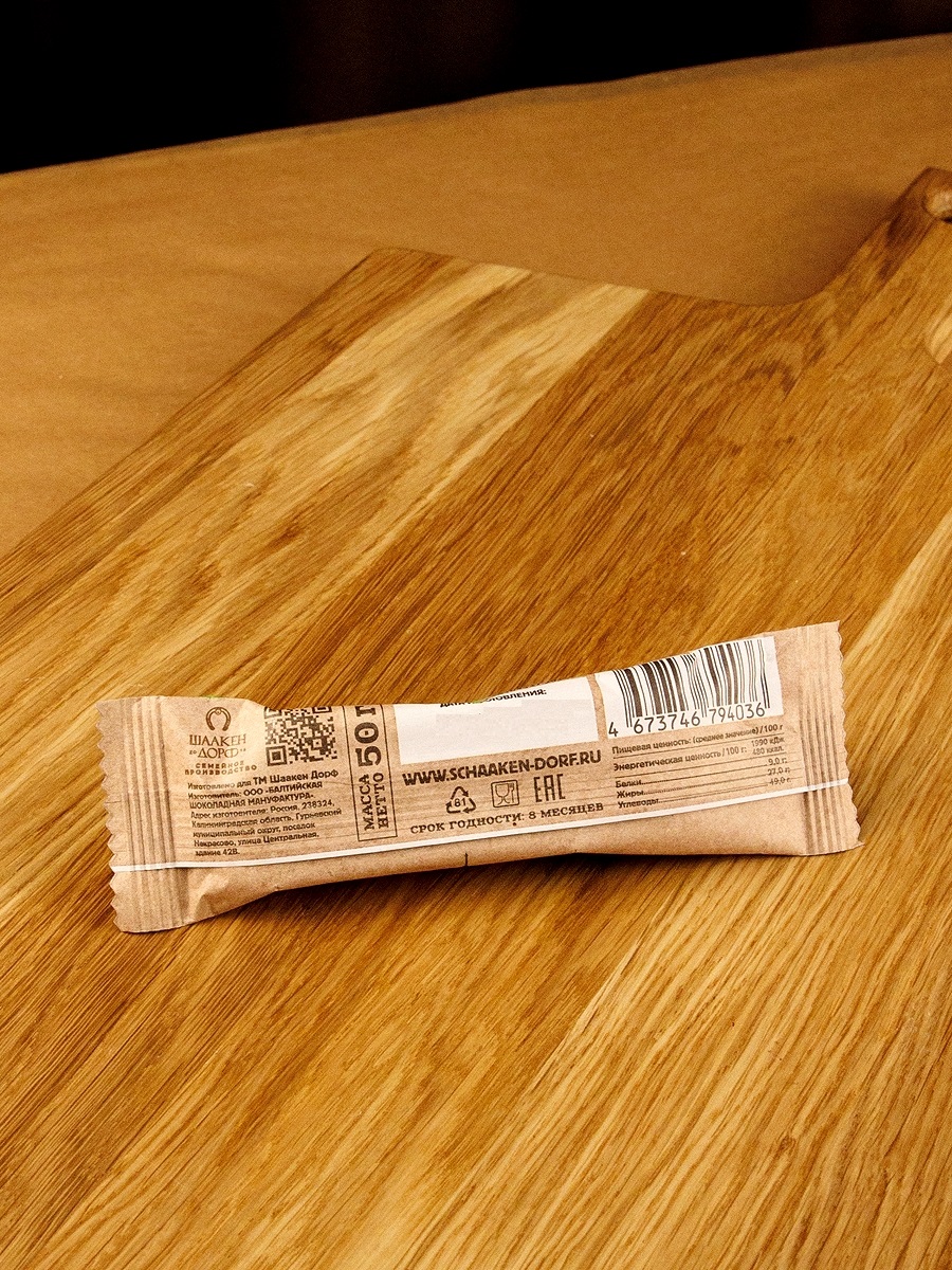 Марципановый батончик (50% миндаля) с сублимированным яблоком и корицей в натуральном темном шоколаде.