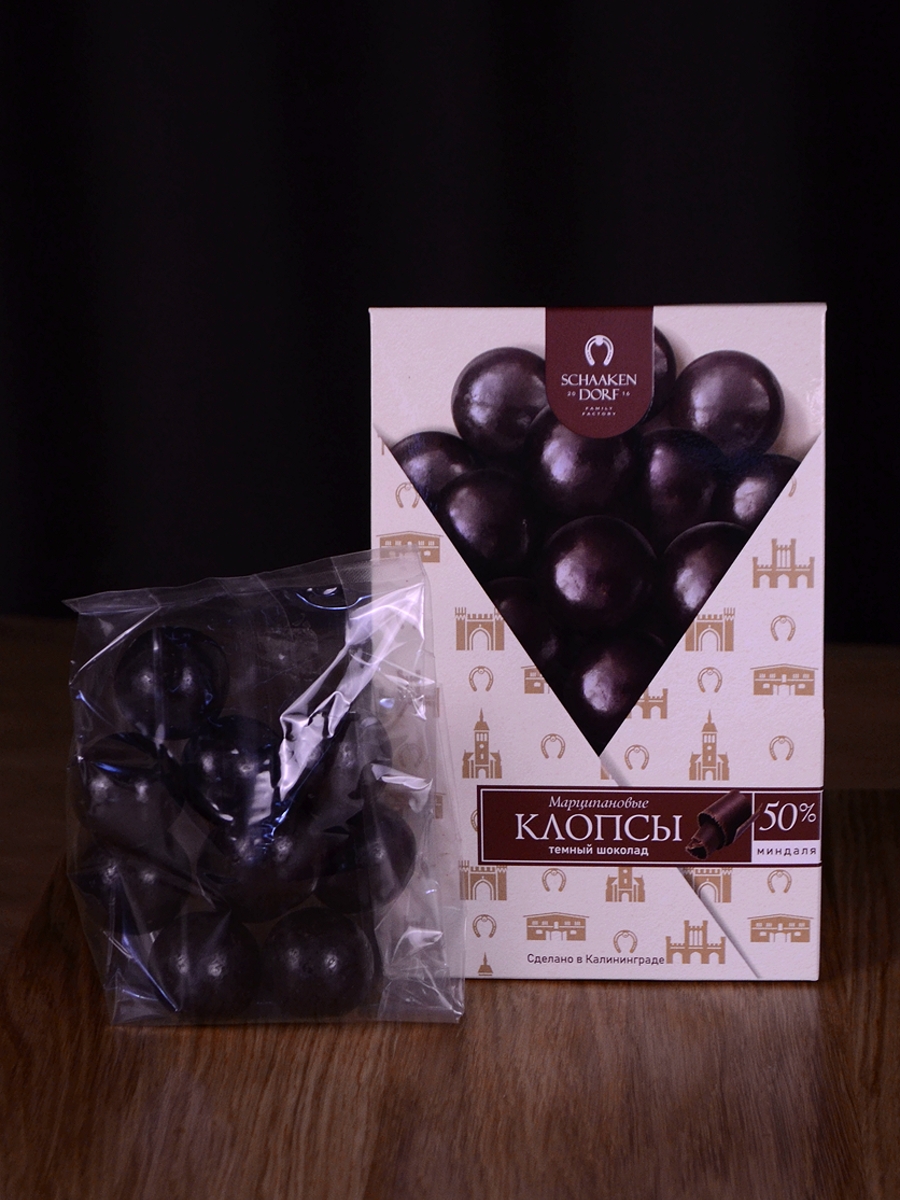 Традиционные калининградские клопсы из марципана (50% миндаля) в натуральном темном шоколаде.
