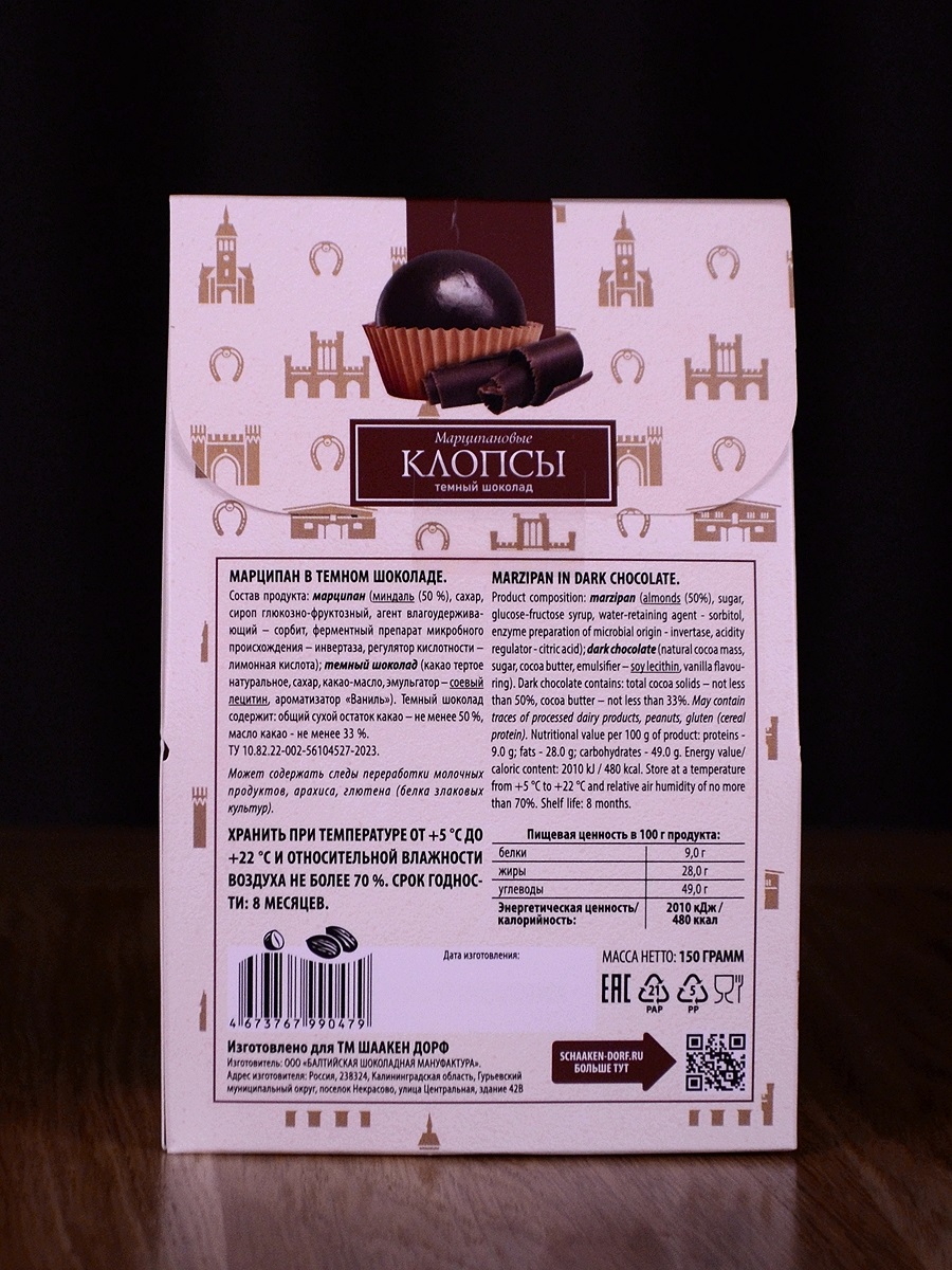 Состав: марципан (сахар, миндаль (50 %), сироп глюкозно-фруктозный, сорбит, инвертаза, регулятор кислотности – лимонная кислота); темный шоколад (какао тертое натуральное, сахар, какао-масло, эмульгатор – соевый лецитин, ароматизатор «Ваниль». Может содержать следы переработки молочных продуктов, арахиса, глютена (белка злаковых культур).