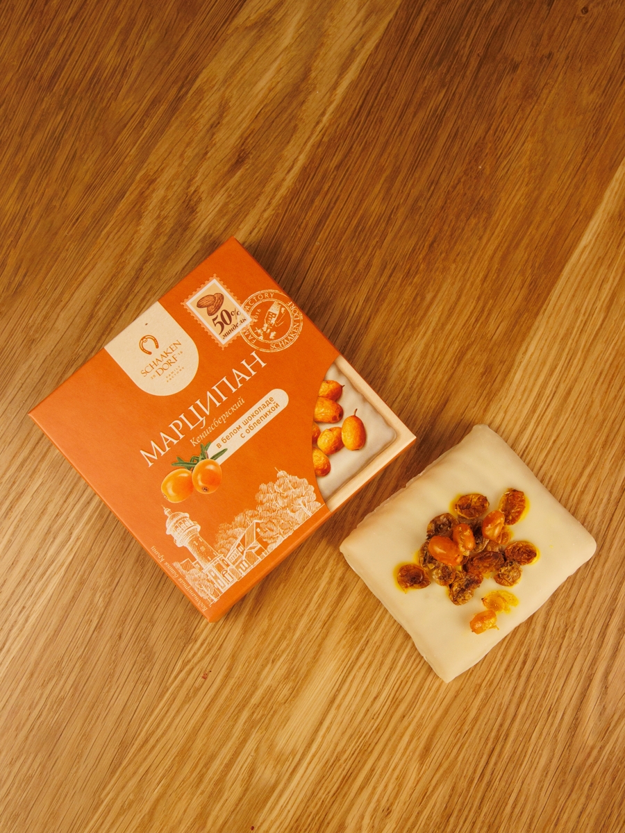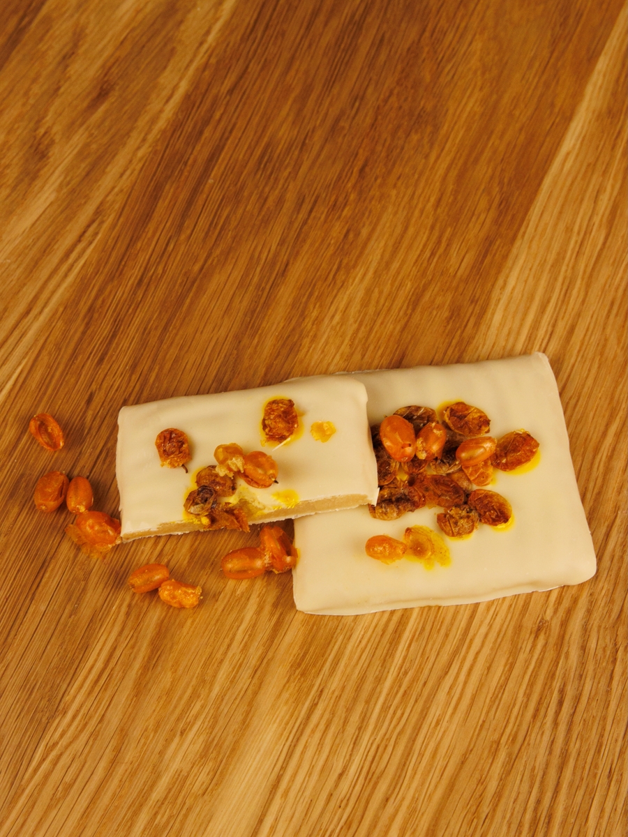 Марципановая плитка (50% миндаля) в натуральном белом шоколаде с обсыпкой из сушеной облепихи.