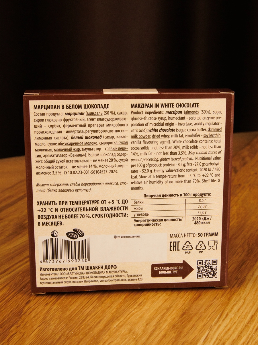 Состав: марципан (сахар, миндаль (50 %), сироп глюкозно-фруктозный, сорбит, инвертаза, регулятор кислотности – лимонная кислота); белый шоколад (сахар, какао-масло, сухое обезжиренное молоко, сыворотка сухая молочная, молочный жир, эмульгатор – соевый лецитин, ароматизатор «Ваниль». Может содержать следы переработки арахиса, глютена (белка злаковых культур).