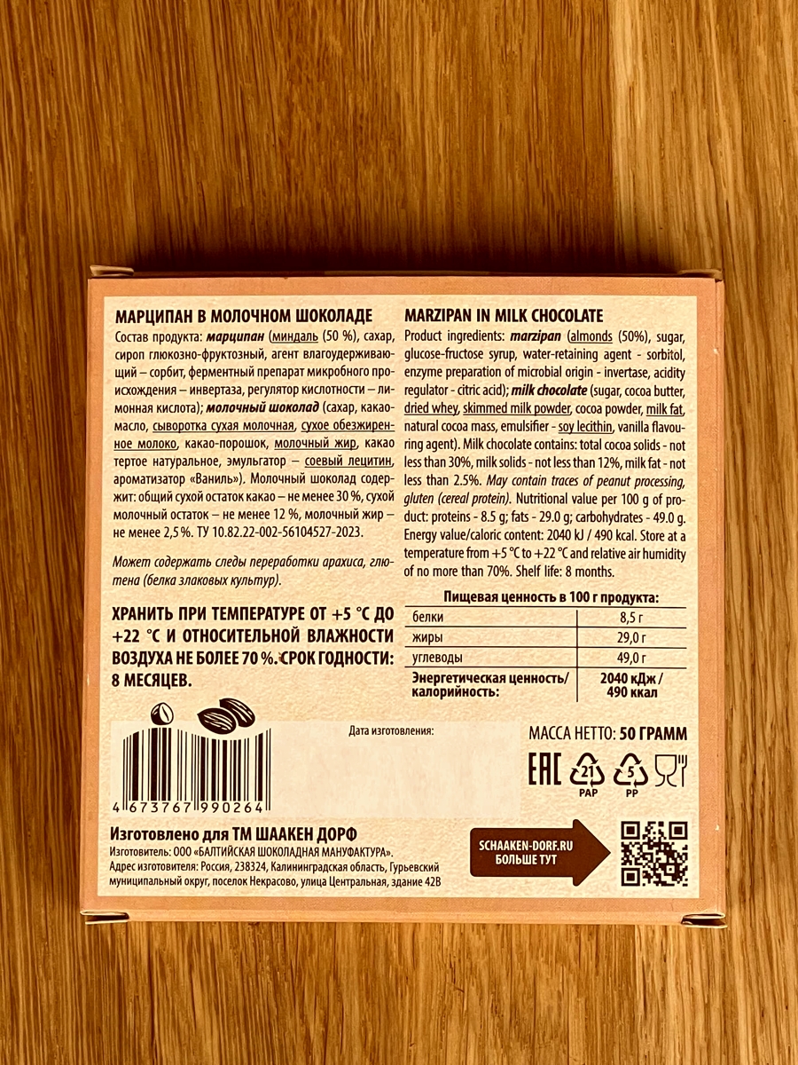 Состав: марципан (сахар, миндаль (50 %), сорбит, инвертаза, регулятор кислотности – лимонная кислота); молочный шоколад (сахар, какао-масло, сыворотка сухая молочная, сухое обезжиренное молоко, какао-порошок, молочный жир, какао тертое натуральное, эмульгатор – соевый лецитин, ароматизатор «Ваниль». Может содержать следы переработки арахиса, глютена (белка злаковых культур).