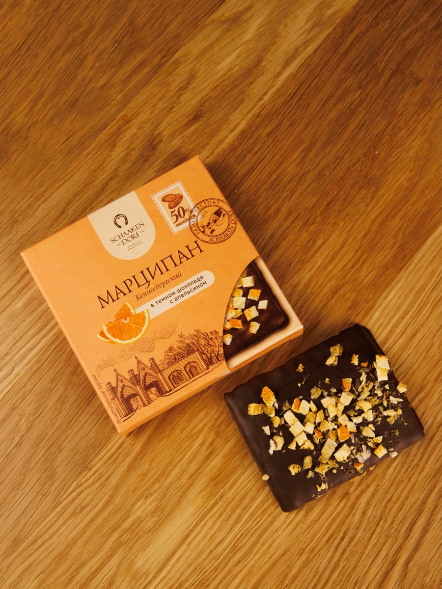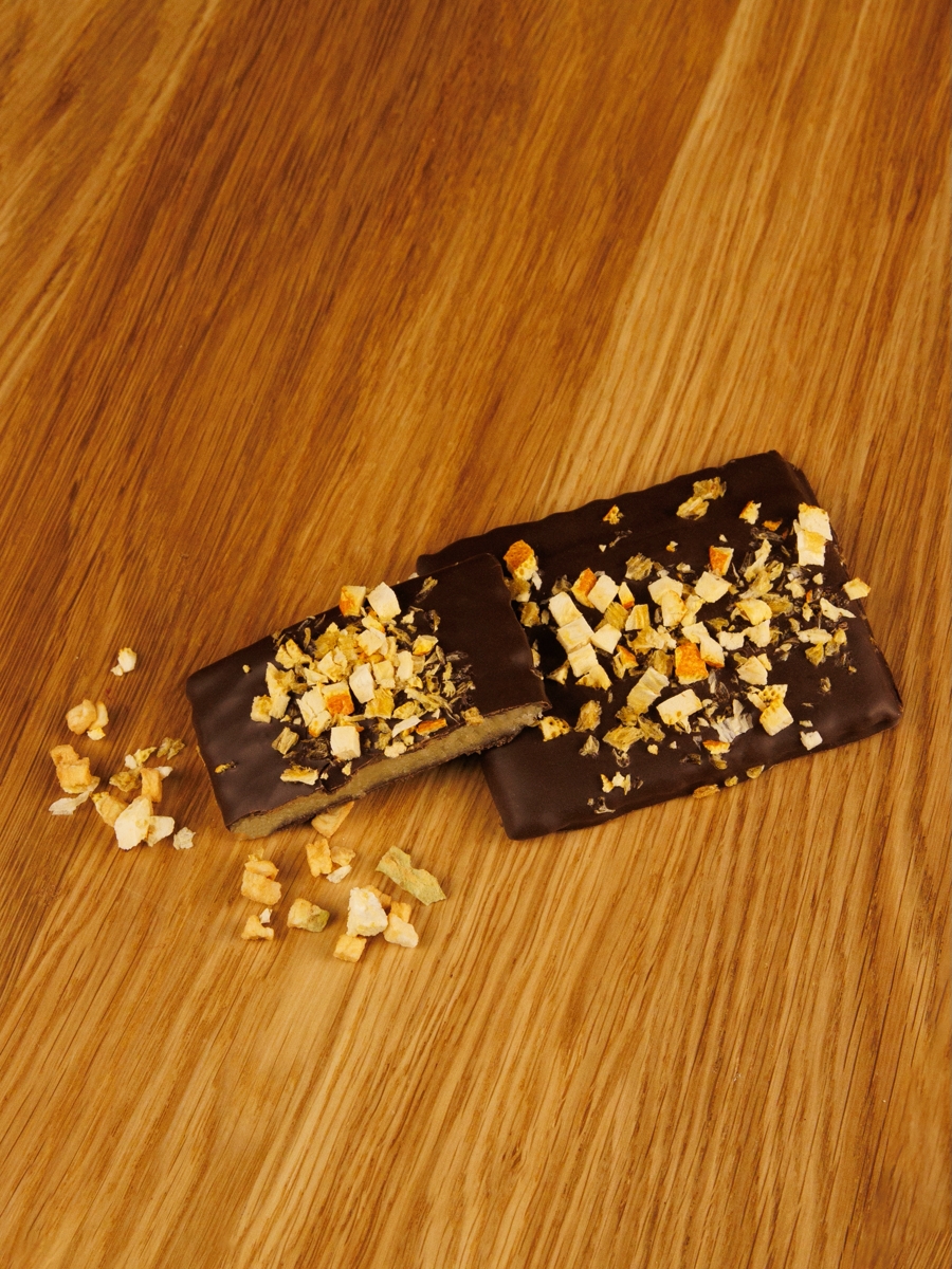 Марципановая плитка (50% миндаля) в натуральном темном шоколаде с обсыпкой из сушеного апельсина.