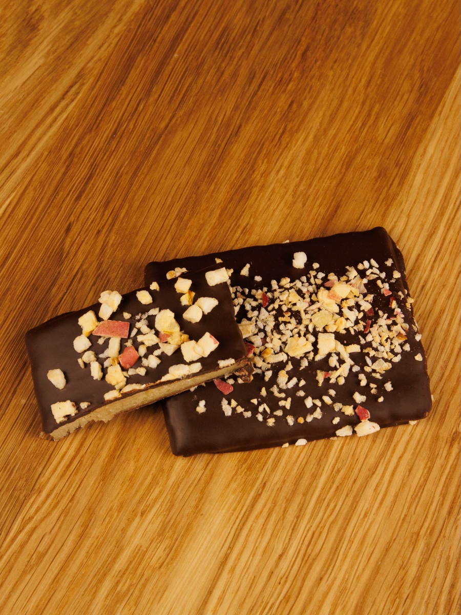 Марципановая плитка (50% миндаля) в натуральном темном шоколаде с обсыпкой из сушеных яблок.