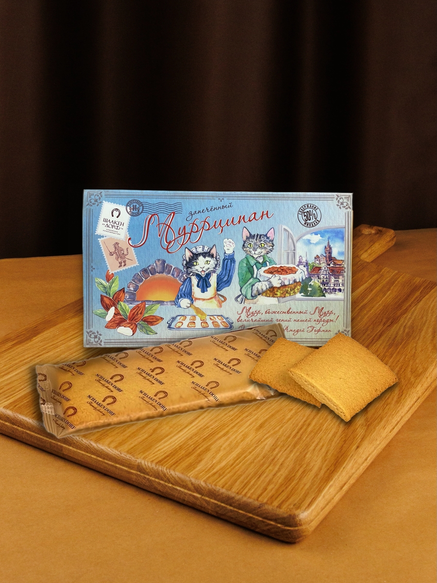 Плитка классического запеченного калининградского марципана. В подарочной коробке с изображением кота Мурра, героя одного из произведений Эрнста Теодора Амадея Гофмана.