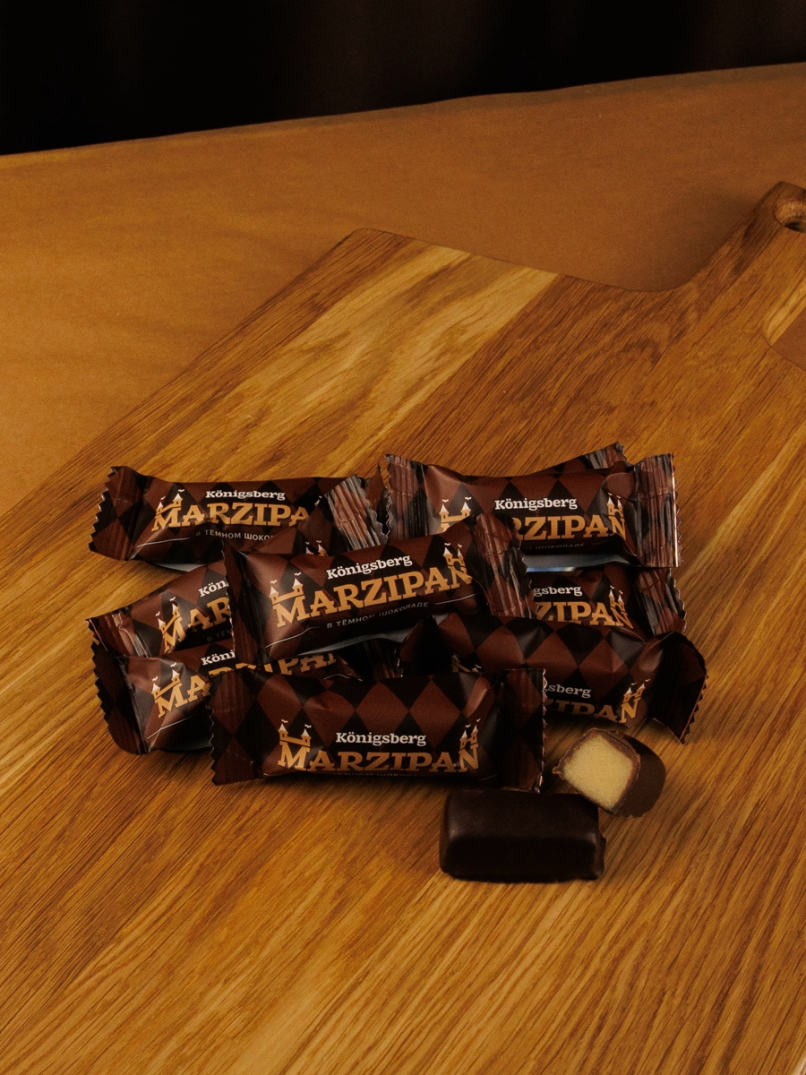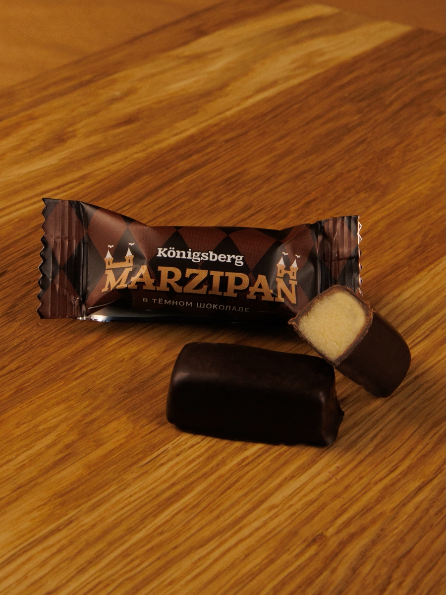 Марципановые конфеты в натуральном темном шоколаде. Крафт-пакет с прозрачным окошком.