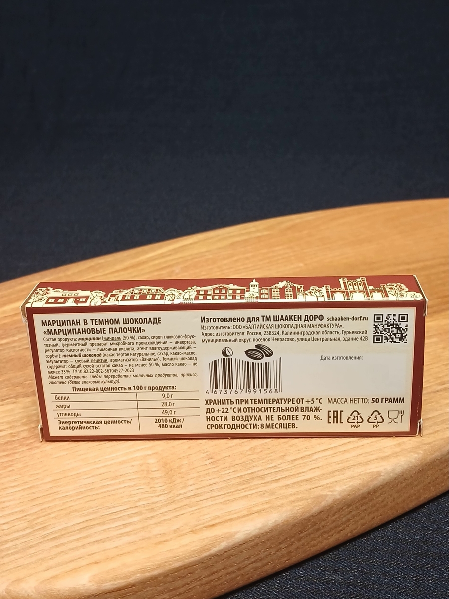 Состав: Марципан - миндаль (50%), сахар, сироп глюкозно-фруктозный, ферментный препарат микробного происхождения - инвертаза, регулятор кислотности - лимонная кислота, агент влагоудерживающий - сорбит. Темный шоколад - какао тертое натуральное, сахар, какао-масло, эмульгатор - соевый лецитин, натуральный ароматизатор "ваниль". Темный шоколад содержит - общий сухой остаток какао не менее 50%, масло какао - не менее 33%. Может содержать следы переработки молочных продуктов, продуктов переработки сои, арахиса, глютена (белка злаковых культур).