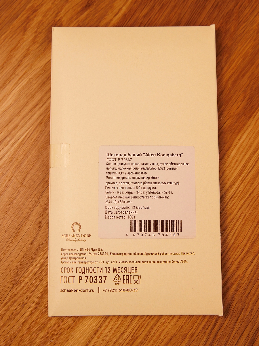 Белый шоколад (30% какао-масла). Упаковка в виде открытки с изображением Кёнигсбергского Замка.