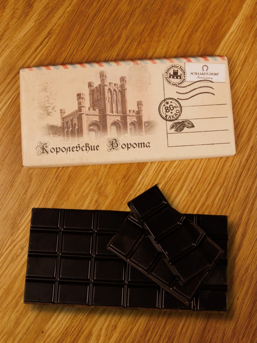 Горький шоколад (80% какао). Обертка с изображением Королевских ворот в Калининграде.