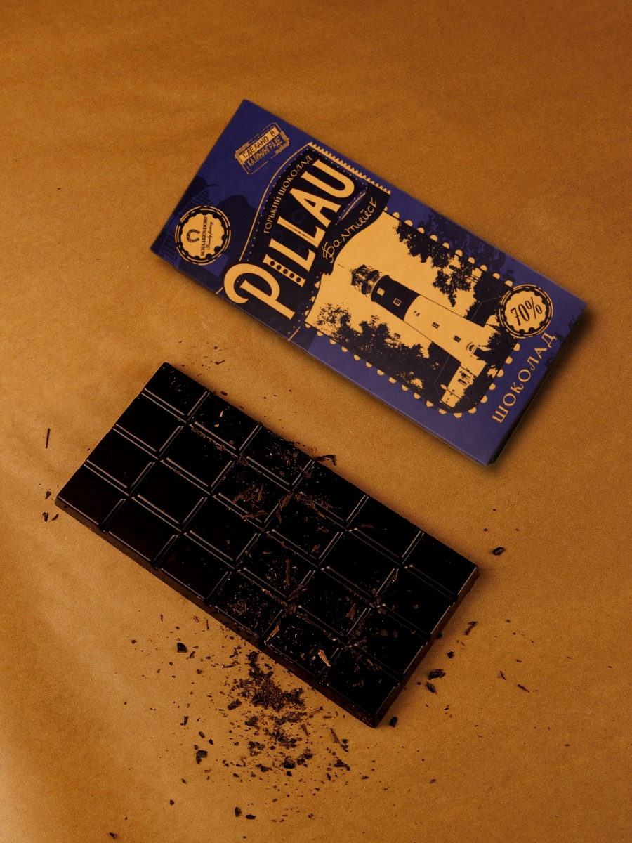 Горький шоколад (70% какао). Обертка с изображением Маяка в г. Балтийск (нем. Pillau).