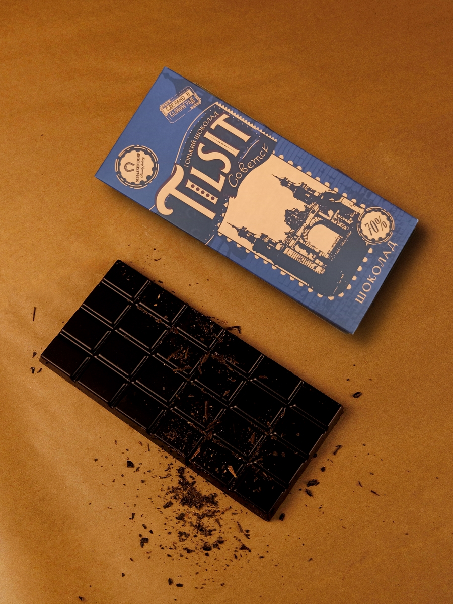 Горький шоколад (70% какао). Обертка с изображением Моста Королевы Луизы в г. Советск (нем. Tilsit).