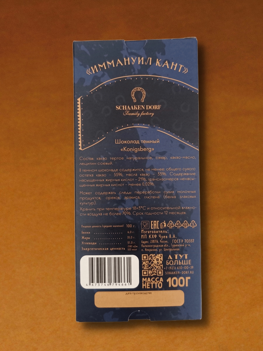 Темный шоколад (55% какао). Обертка с портретом Иммануила Канта.