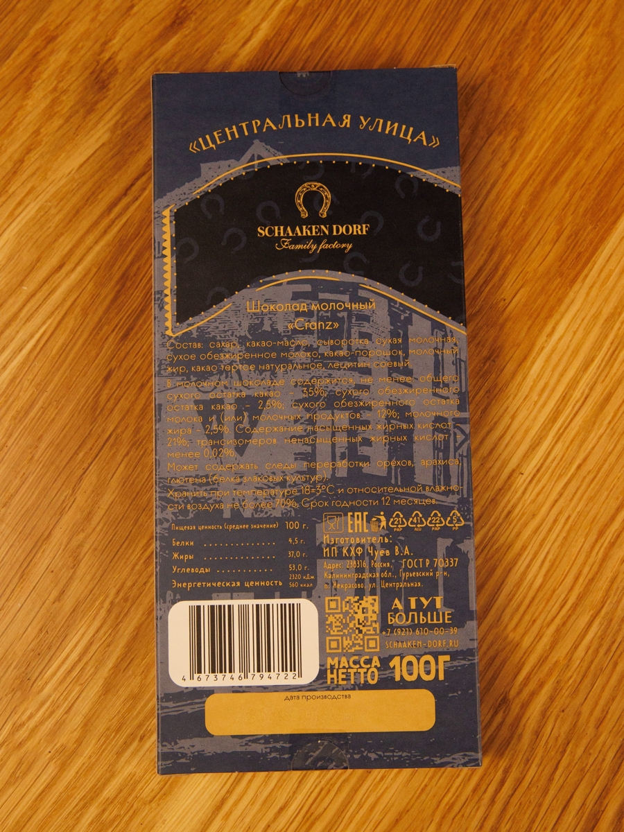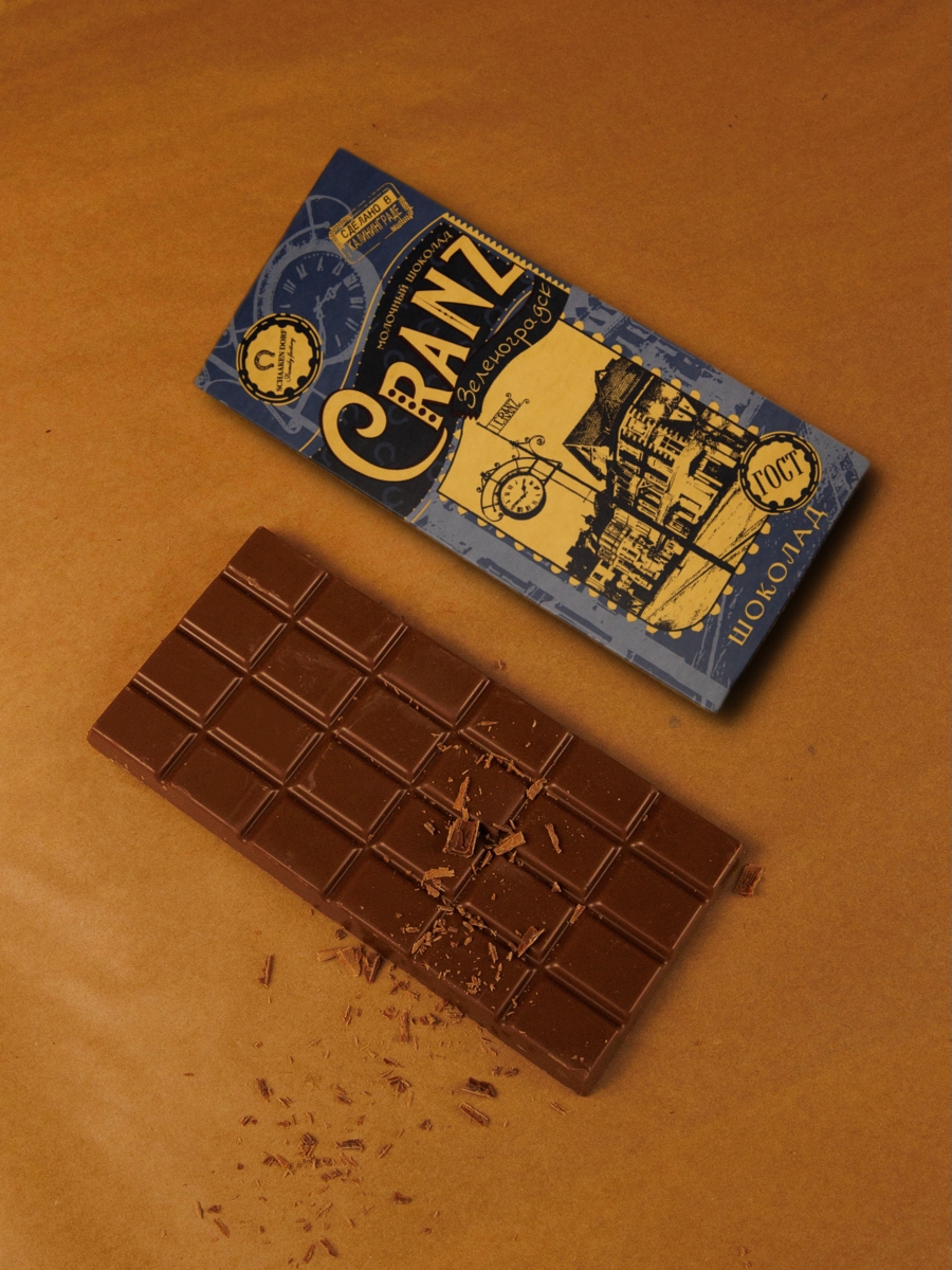 Молочный шоколад (35% какао). Обертка с изображением Центральной улицы в г. Зеленоградск (нем. Cranz)